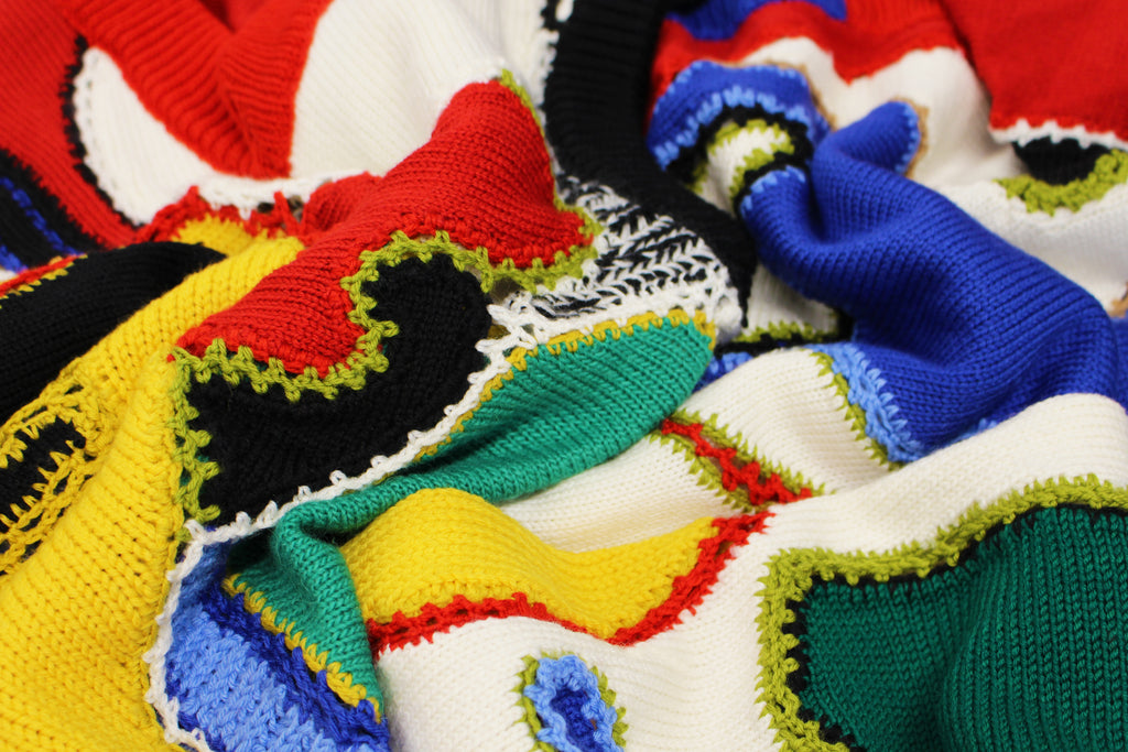 For the All Our Stories collection, we collaborated with the Mending For Good network, as knitwear was a key area of development. The knitwear for this collection was designed in collaboration with Alice Morell Evans, using Sesia Wool industry waste sample swatches, crocheted together with Seisia organic bio wool by the team at Manusa.