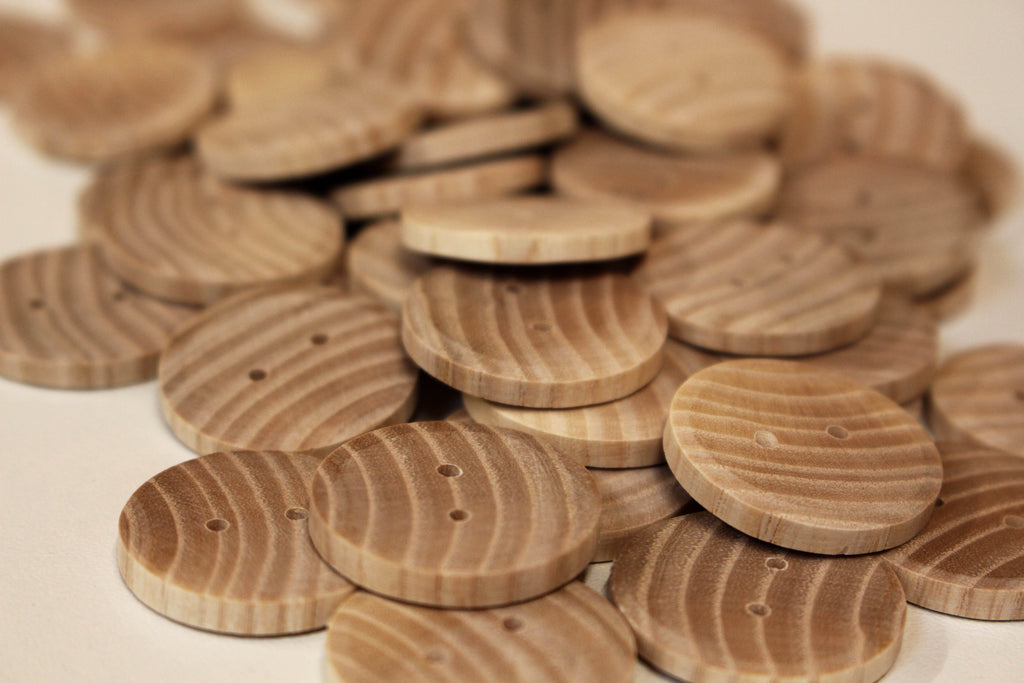 Our buttons are made from English Ash, (a quick growing native hardwood) processed into round spindles at LGW, then dried out to complete in Spencer’s workshop. As they dry the spindles become oval, so have to be re-turned on a lathe to size. The round cylinders are then cut into discs using a table saw and the button holes are drilled on a small pillar drill before sanding to finish by Spencer himself.
