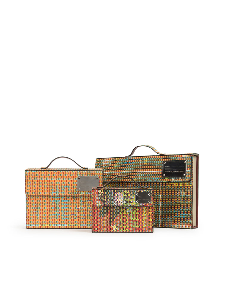 Social Manufacturer San Patrignano weaves with waste materials, to create statement fabrics for our collections, with heritage techniques and social responsibility at heart. Used as the statement fabric for our Woven Book Bags. The Woven Book Bag comes in 4 sizes with a detachable crossbody belt, a customer nameplate, and is made from 100% vegan products.