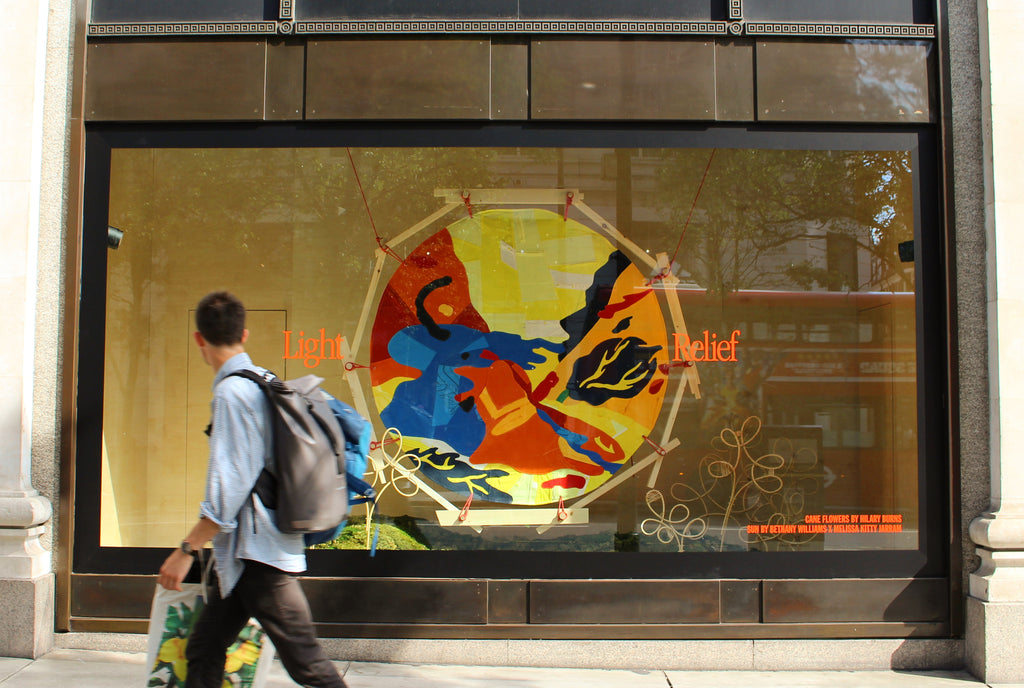 The artwork was installed in July 2021, displayed in the windows of Selfridges Oxford Street, alongside floral sculptures by Hilary Burns with vinyl lettering reading ‘Light Relief’.